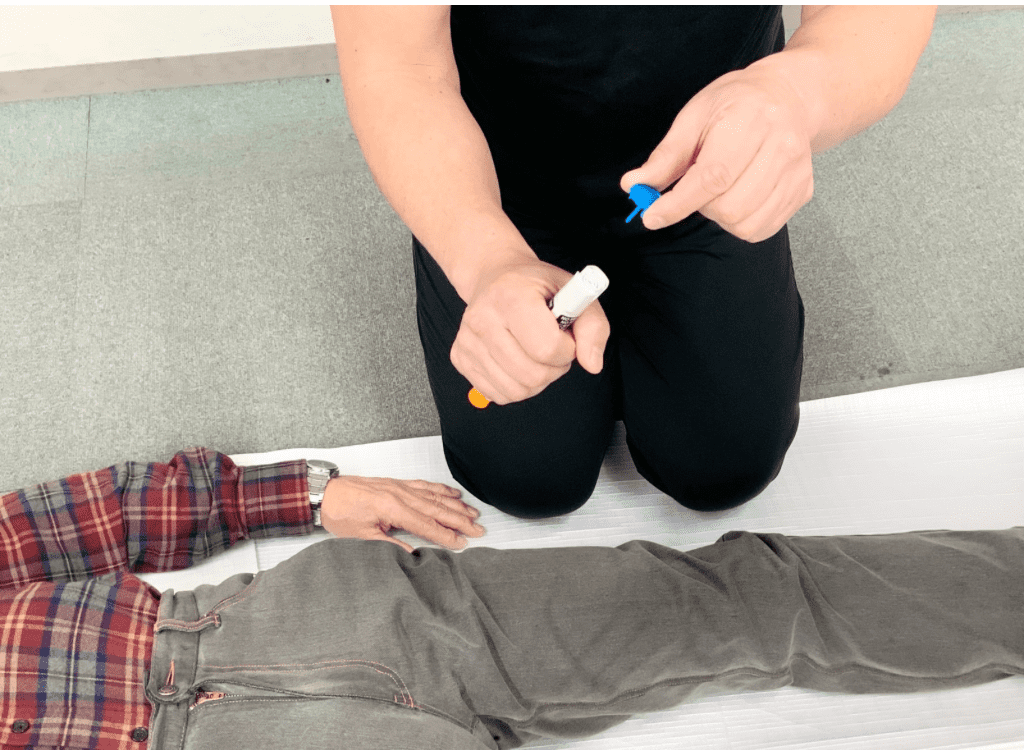 【実習】 当プログラムでは、アナフィラキシー症状に関する知識を深めるための教材として、エピペン®トレーナーを用いた実践的なロールプレイを取り入れています。参加者は、以下の資料とツールを使用して学習を進めます。